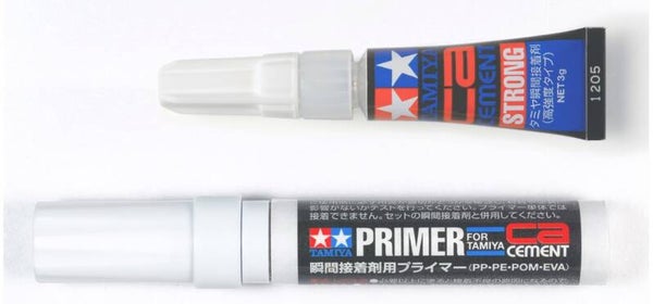 This handy set includes both primer and CA cement for use with parts molded in difficult-to-cement polypropylene (PP), polyethylene (PE), polyacetal (POM) and EVA. ★First, apply a thin coat of primer on the parts, allow it to dry, and then apply cement to one side of the joint. These finishing materials can also be used when cementing the named plastics to standard styrene parts, applying primer to the non-styrene part only. ★Primer: 3g, CA cement: 3g.