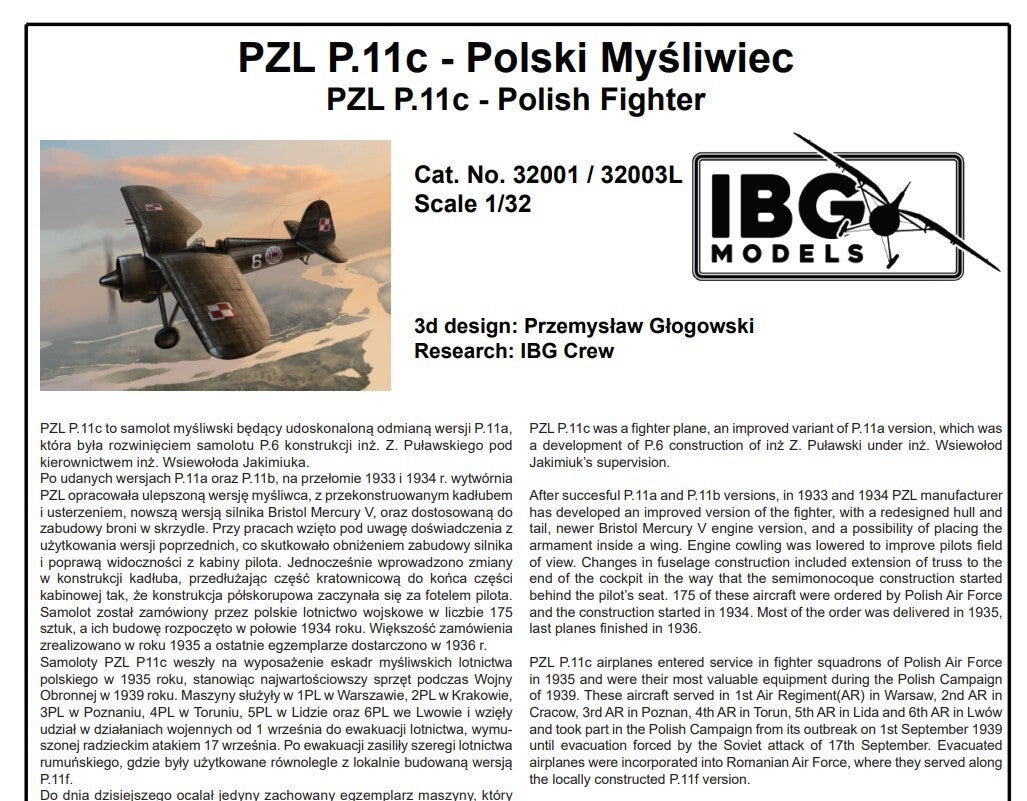 IBG MODELS : REF : IBG32001 : 1:32 : AIRCRAFT KIT : Poland : PZL : P.11c Fighter (Modellfan Prize !)