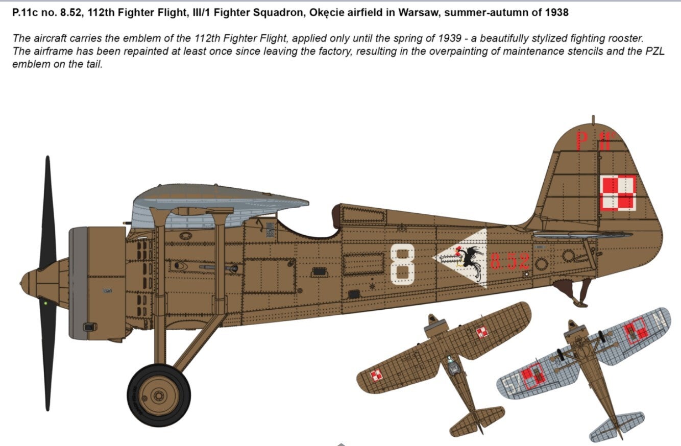 PZL P.11c airplanes entered service in fighter squadrons of Polish Air Force in 1935 and were their most valuable equipment during the Polish Campaign of 1939. These aircraft served in 1st Air Regiment(AR) in Warsaw, 2nd AR in Cracow, 3rd AR in Poznan, 4th AR in Torun, 5th AR in Lida and 6th AR in Lwów and took part in the Polish Campaign from its outbreak on 1st September 1939 until evacuation forced by the Soviet attack of 17th September. Evacuated airplanes were incorporated into Romanian Air Force, where they served along the locally constructed P.11f version.
