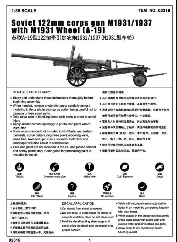 TRUMPETER : REF : TRU02316 : 1:35 : Soviet : 122mm corps gun M 1931 / 1937 with M1931 Wheel (A-19)