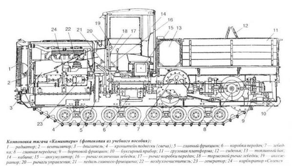 The Komintern artillery tractor was based on the suspension of the T-12 tank and later the T-24 (2,000 built from 1935 to 1941), powered by a 131-hp diesel engine. Despite the dismal fate of its predecessor tanks, the tractor was more successful and was put into mass production. Of course, the Komintern inherited several of the T-24's disadvantages, but some of them were fixed by designers, others were not as significant for tractor as for a tank. The Komintern was used to tow medium artillery such as the ML20 152 mm gun-howitzer.