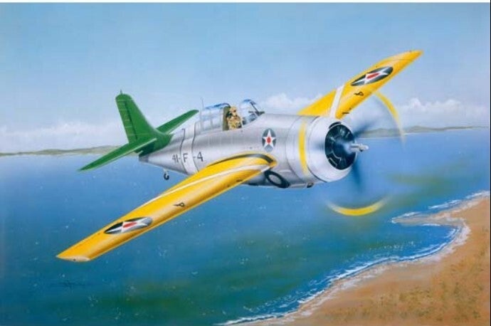 Grumman's short and stubby-winged F4F Wildcat is one of its best-known and successful fighters. The F4F-3 Wildcat had a rather short, rounded fuselage with mid-wings of rectangular shape. The wings did not fold for carrier storage. All the main parts of the airplane were located in the front part of the tubby fuselage, the fuel tank and retractable landing gear were right under the pilot. This concentration of weight made for a quick handling, maneuverable fighter. Its Pratt & Whitney 1200hp, 14-cylinder, air-cooled, twin row radial engine (R-1830-76 or 86) gave it a top speed of 330 mph. The F4F-3 had a range of 845 miles. The standard armament was four .50 caliber wing mounted machine guns. Service ceiling was 37,500 ft. The F4F-3 offered good durability, pilot armor, and a high dive speed. It also had good maneuverability, although it was soon discovered that it could not compete with the Japanese Zero in this area. A common complaint from pilots was the manual hand-cranked retracting landing gear, which required 30 cranks. One slip could result in a serious wrist injury. Powerplant: P&W 1,200hp R-1830-36 14-cylinder radial engine. Maximum Speed: 318 mph at 19,400 feet. Service ceiling: 39,400 ft. Range: 770 miles. Weight empty: 5,758 lbs. Maximum take-off weight: 8,152 lbs. Span: 38 ft. Length: 28 ft. 9 in. Height: 9 ft. 2.5 in. Armament: Four 0.5 inch Browning machine guns; two 100 lb. bombs.
