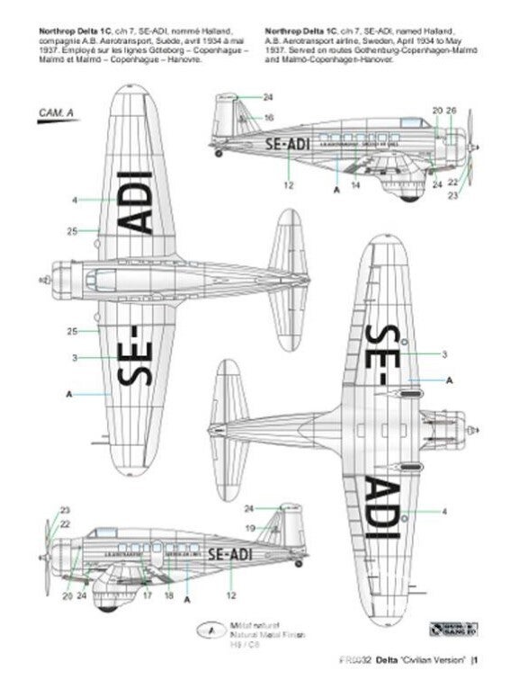 - Cam A : Northrop Delta 1C, c/n 7, c/n 7, SE-ADI, nommé Halland, compagnie A.B. Aerotransport, Suède, avril 1934 à mai 1937. Employé sur les lignes Göteborg – Copenhague – Malmö et Malmö – Copenhague – Hanovre.