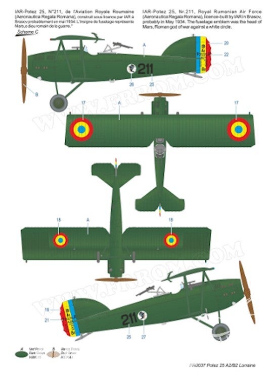 - Camo C : IAR-Potez 25 B2 n°211, Armée de l'Air Roumaine, appareil construit sous licence par IAR à Brasov probablement en mai 1934. L'insigne de fuselage représente Mars, le dieu romain de la Guerre.