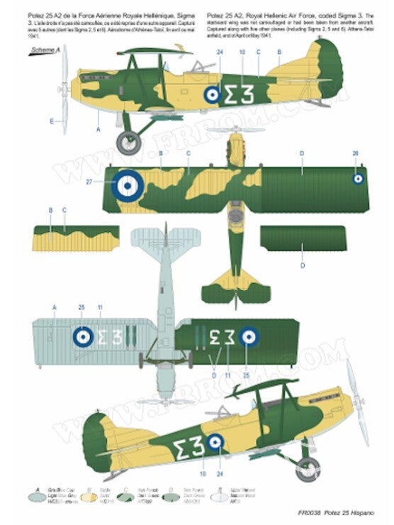 - Camo A :Potez 25 B2 de la Force Aérienne Royale Hellénique, Sigma 3. L'aile droite n'a pas été camouflée, ou a été reprise d'une autre appareil. Capturé avec 5 autres (dont les Sigma 2, 5 et 6). Aérodrome d'Athènes-Tatoï, fin avril ou mai 1941.
