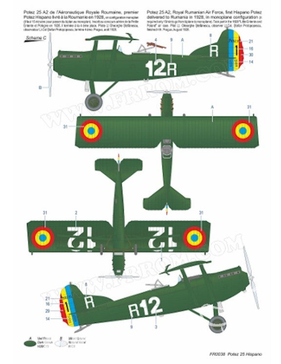 - Camo C : Potez 25 A2 de l'Aéronautique Royale Roumaine, premier Potez Hispano livré à la Roumanie en 1928, en configuration monoplan (il faut 15 minutes pour passer du biplan au monoplan). Inscrit au concours aérien de la Petite Entente et Pologne en 1928. Pilote Lt Gheorghe Stefanescu, observateur Lt-Col Stefan Protopopescu, termine 4 ème. Prague, août 1928.