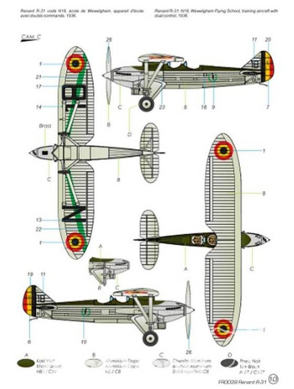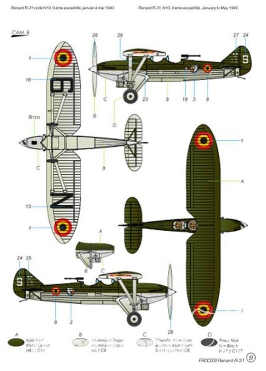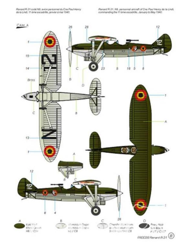 - Cam B, R-31 codé N9, avion personnel du Cne Paul Henry de la Lindi, 11 ème escadrille, janvier à mai 1940 (Sioux Rouge).