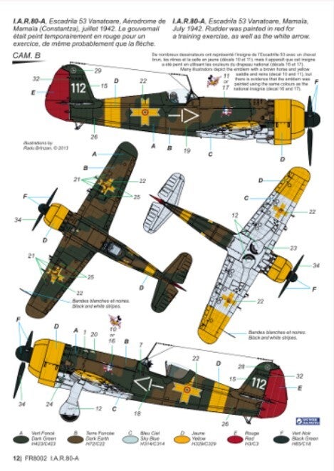 - Cam B, IAR-80A n°112, escadrille 53 (Mickey à cheval), groupe 7, Mamaïa (Constantza), juillet 42. Le gouvernail rouge et la flèche ont probablement été peints à l'occasion d'un exercice.
