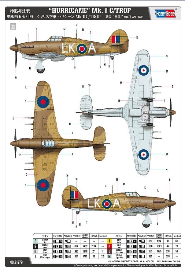 HOBBY BOSS : REF : HB81779 : 1:48 : AIRCRAFT KIT : UK (RAF) : Hawker Aircraft : Mk.ⅡC/TROP (“Hurricane”)