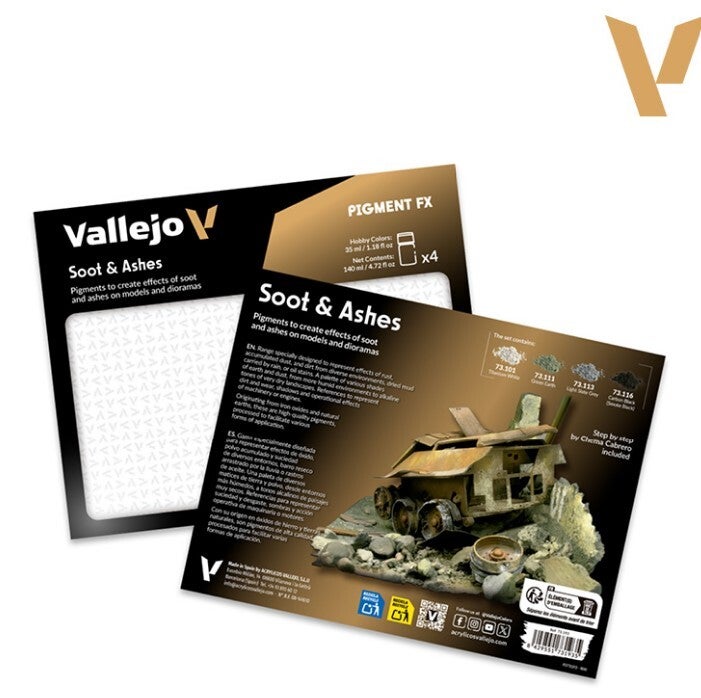 The pigment set includes a step by step guide by Chema Cabrero to assist in creating the effects of soot and ashes on models and dioramas.