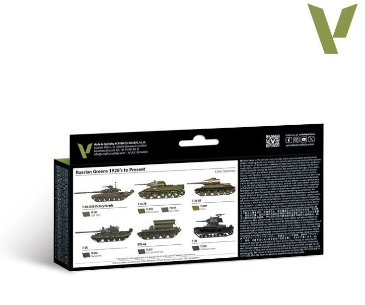 The set includes all the shades of green used for base colors and camouflage patterns. From the beginning in the twenties of the mechanization of the army of the Soviet Union, including tanks and light and heavy vehicles, camouflage patterns were considered, and shades of green were employed as a standard base color.