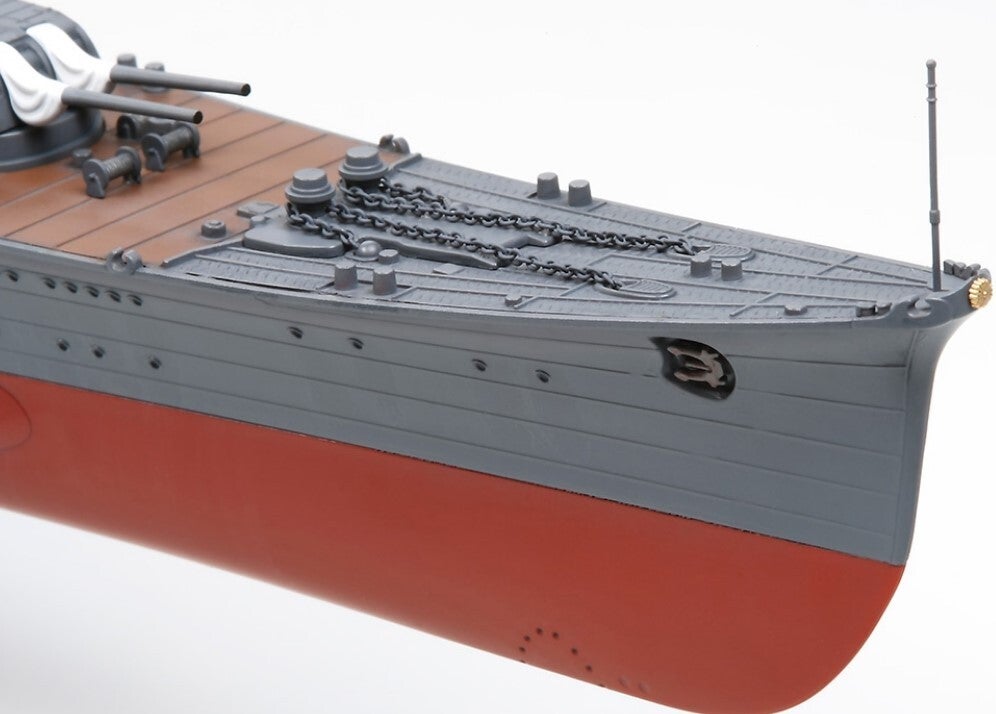 This is a 1/350 scale plastic assembly kit of the Japanese Aircraft Carrying Cruiser Mogami. Length: 573mm, Beam: 76mm. The 1943 reformed model of the Mogami with its uniquely styled aircraft deck has been accurately reproduced. The ships hull separates into port and starboard parts and one-piece lower hull helps to produce the form of the beautiful bow. Large sized parts depicting the ship's hull and flight deck are secured with screws allowing you to accurately build the model. The precision moldings of the super structure and funnels provide a realistic finish. Transparent parts accurately depict glass part such as the bridge's windows and searchlight lenses. The main guns, torpedo launchers, high angled guns, and catapult are moveable. You can choose either to have the main guns in a stowed or deployed position. Parts such as mast and antenna's are made from strong ABS resin parts. Each machine gun part, fire extinguisher, and heat dissipation board are rich in detail. Photo-etched parts are included for parts such as the crane, catapult, aircraft propellers, aircraft transport trolley, and catapult trolley for an ultimate realistic finish. Metal parts depict anchor chains and propeller shafts. Set includes detailed 3 Mitsubishi F1M and 8 Aichi E13A. Display stands for depicting aircraft in flight are included. Full hull model display stand included.