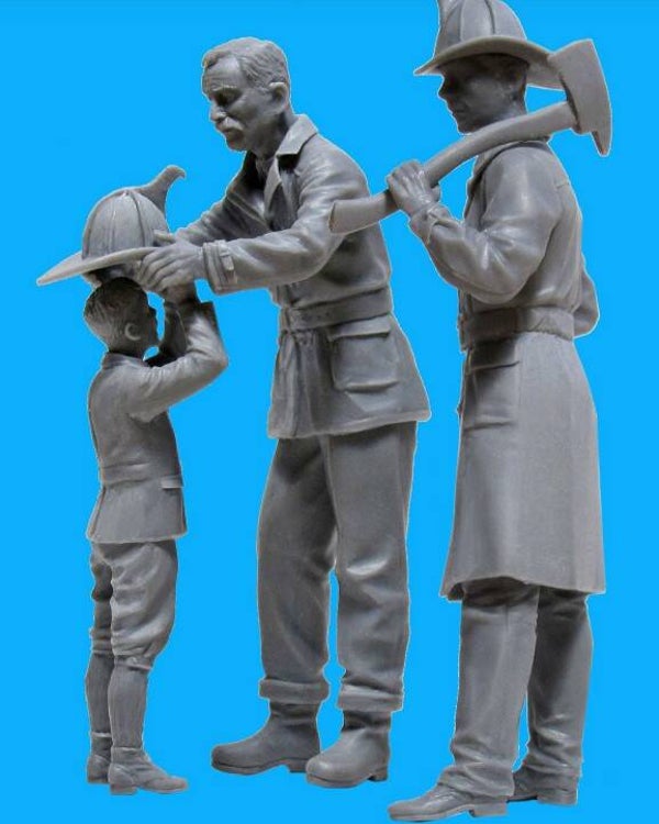 The set includes 28 parts for assembly of 3 figures: two American firemen of 1910s period and a boy.