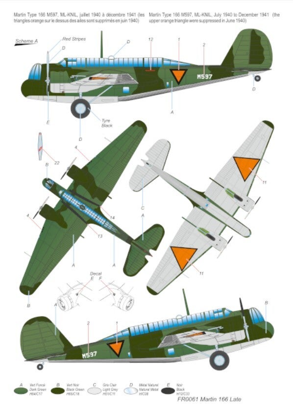 - Martin Type 166 M597, ML-KNIL, juillet 1940 à décembre 1941 (les triangles orange sur le dessus des ailes sont supprimés en juin 1940)