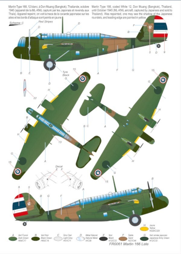 - Martin Type 166, 12 blanc, à Don Muang (Bangkok), Thailande, octobre 1945 (appareil de la ML-KNIL capturé par les Japonais et revendu aux Thaïs). Appareil repeint, on voit la trace de la cocarde japonaise sur les ailes et les bords d'attaque sont peints en jaune