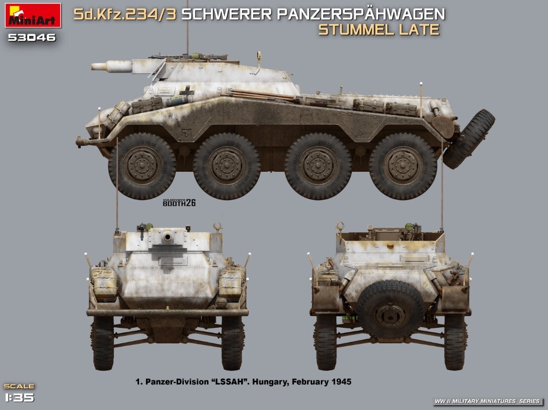 This kit represents the late production version of the Sd.Kfz.234/3 “Stummel,” a heavy armored reconnaissance vehicle armed with a short 7.5 cm gun. Designed to provide mobile fire support, it combined strong armament with the excellent cross-country performance of the 8-wheel chassis.