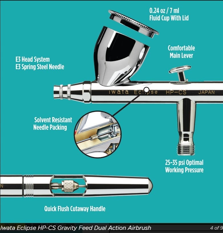Iwata Eclipse HP-CS Gravity Feed Dual Action Airbrush has a generous 0.24 oz / 7 ml fluid cup with lid that is ideal for color mixing.