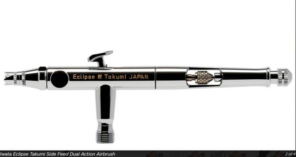 Iwata Eclipse Takumi Side Feed Airbrush, first and foremost, has all of the spray attributes of Iwata Eclipse Series airbrushes. In addition this side feed model has a redesigned, compact body style for improved control and balance. This, combined with a new gravity assisted side feed cup improves paint flow, making Takumi remarkably responsive. The two-piece 0.24 oz/7 ml cup design disassembles for easy cleaning and siphon cut lid helps reduce paint build-up.