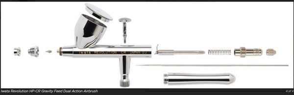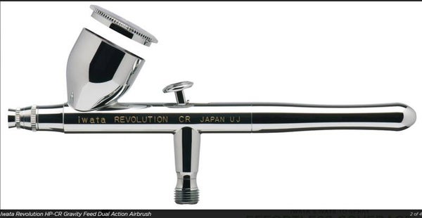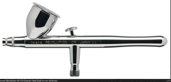Exclusive to Revolution Series, HP-CR Gravity Feed Dual Action airbrush features a unique, comfort handle. Iwata Revolution HP-CR has a 0.24 oz 7 ml fluid cup with lid that is ideal for color mixing.