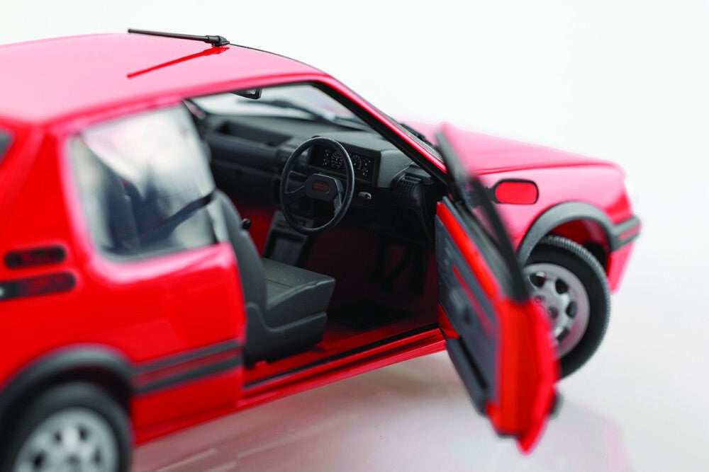 The 205 is a small car produced from 1983 to the end of 1998 by the French car manufacturer Peugeot, which began development in 1978. The sporty 205 GTI followed in 1984. In 1986, the GTI produced a whopping 128 hp (94 kW) from a 1.9 liter engine and reached a top speed of around 200 km/h while weighing just 921 kg. Peugeot‘s own styling department, La Garenne, was responsible for the design under the direction of Gérard Welter. The sporty small car, which came onto the market in 1984 as a competitor to the Golf GTI, became an object of desire for more than just a whole generation of young French people. Understatement was still a foreign word in the truest sense of the word in the 1980s, with larger aluminum rims and fender flares that ended in red decorative stripes, the 205 GTI, available as a two-door model, stood out visually from the other Peugeot 205s. After a Peugeot 205 Turbo 16 won the World Rally championship in 1985, the 205 GTI was the hype par excellence.