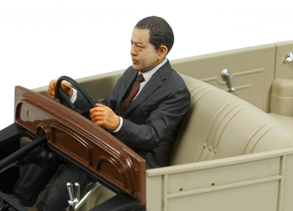 This is a 1/24 scale static model assembly kit of the Toyoda Model AA. Length: 202mm, width: 73mm, height: 75mm. The luxuriously styled Model AA body is breathtakingly captured, with rounded front grille and flowing fenders. Features realistic detailing of front/rear seats and driver position. Frame, engine underside and suspension are authentically rendered. Metal-plated parts recreate bumpers, front grille and windshield wipers. Bonnet and body side line details are depicted by metallic finish decals. Driver figure included.